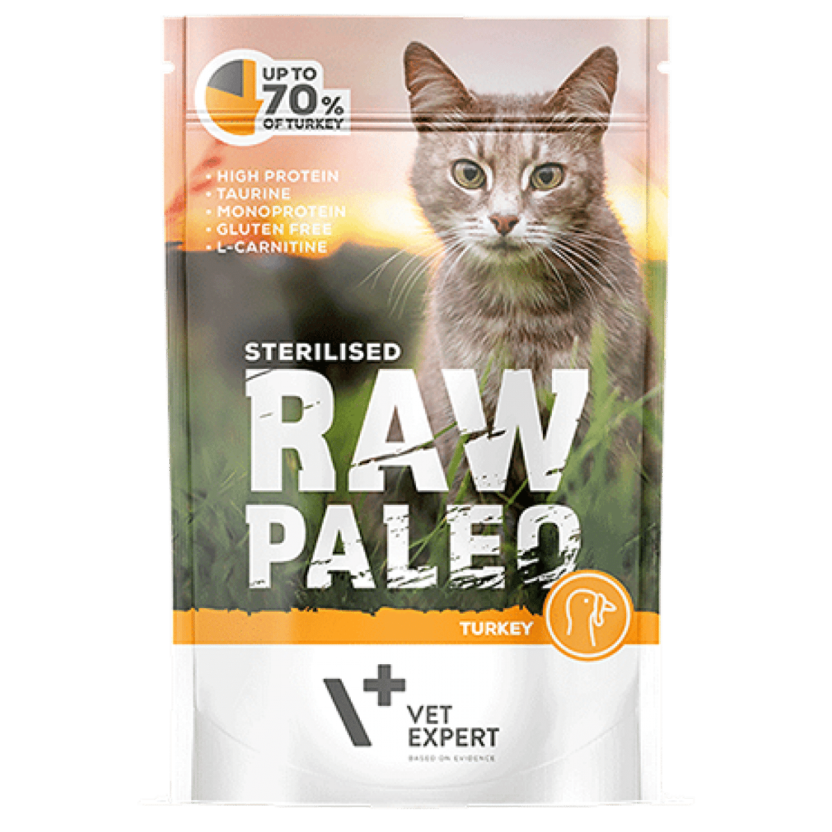 Η Raw Paleo υγρή τροφή σε φακελάκι 100 γρ., είναι μια σειρά από πλήρης τροφή για στειρωμένες γάτες που παρασκευάζεται με φρέσκο κρέας και φυσικά συστατικά για υψηλή γευστικότητα και κάλυψη κάθε ιδιαίτερης ανάγκης της γάτας σας. Γεύση Γαλοπούλα
